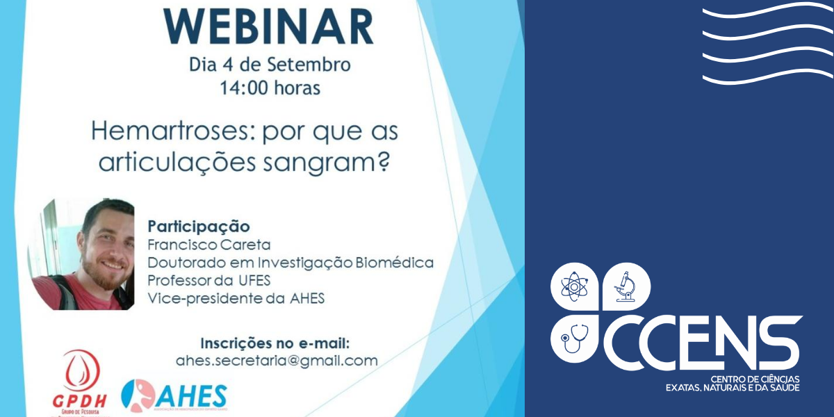 O Grupo de Pesquisa em Desordens Hemorrágicas da UFES, em colaboração com a Associação dos Hemofílicos do Espírito Santo, convida toda a comunidade para participar do Webinar com o tema "Hemartroses: por que as articulações sangram?", que será realizado no dia 4 de setembro às 14 horas com a participação do Prof. Francisco Careta (Departamento de Farmácia e Nutrição/CCENS).